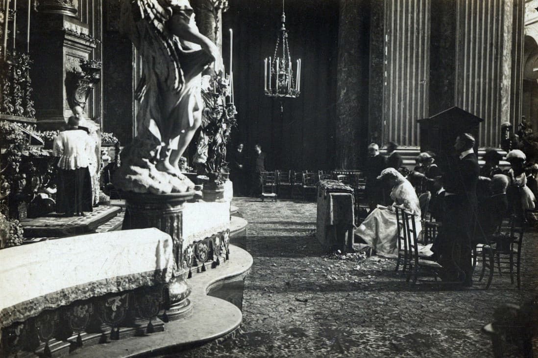 Immagine storica di sacerdote gesuita e sposi durante la celebrazione di un matrimonio